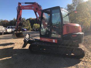 67hp kubota diesel engine, 26gpm hydraulic flow, 14,660lb breakout force, weight 18,000lbs, 87″ width, cab w/heat and air, angle blade, hydraulic thumb, max dig depth 15.1′,