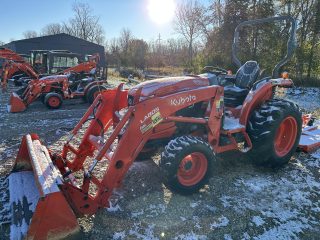 37hp kubota diesel engine, hst transmission, 4×4, 540 rear pto, cat 1 3 point hitch, la805 with skid steer quick attach, 72″ quick attach bucket, r4 tires, s#8402